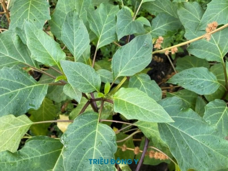 | Hình thái lá | Lá đơn, mọc cách; phiến lá hình trứng, đáy lá không đều, mép lượn sóng hoặc xẻ răng cưa. |